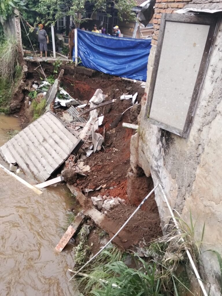SUMEDANG, Sumedang-news.web.id. Erosi atau Pengikisan tanah pada bantaran Sungai cikeruh , Desa sayang kecamatan jatinangor Sumedang menyebabkan salah satu rumah warga rusak yang berada di bantaran sungai,perbatasan desa sayang dan desa mekargalih.